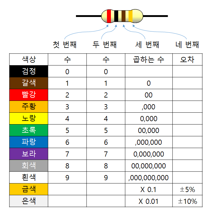 첫 번째 색띠와 두 번째 색띠는 각각 한 자리 씩의 숫자를 나타내고 있으며, 세번째 색띠는 10을 몇 번 곱해야 하는지를 나타냅니다.