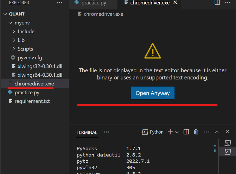 파이썬에서 가상환경을 만들어 사용하는 방법을 알려드리겠습니다. 저는 새로운 가상환경을 만들어서 xlwings를 설치할 거라서 저렇게 입력을 해주었습니다. 일단 vscode를 여시고 practice.py 파이썬