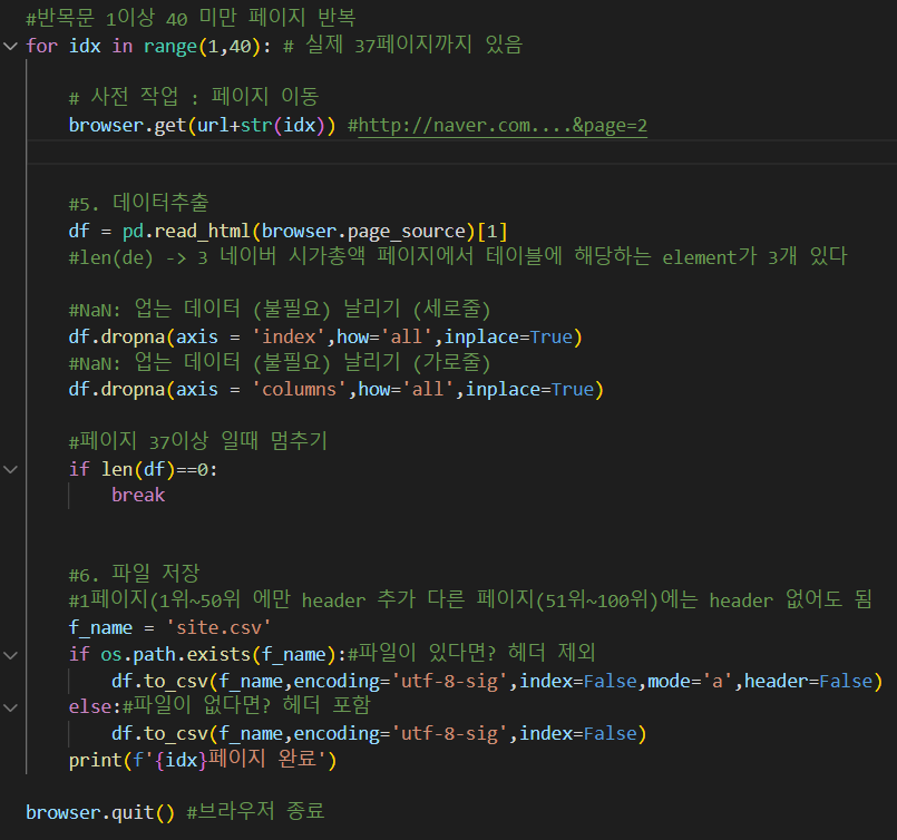 페이지는 37 페이지여서 df의 데이터가 0 이면 멈추라는 명령어를 넣어 줍니다.