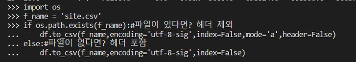 #만약 파일이 존재한다면, df.to_csv 메서드를 사용하여 DataFrame을 해당 파일에 append mode(mode='a')로 저장