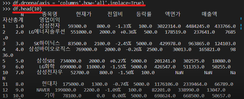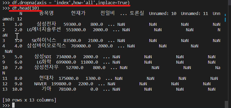 이부분에서 세로 빈 줄이 전체다 NaN으로 인식되는 것 같습니다.