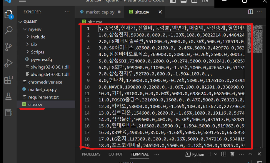 'site.csv'라는 파일에 DataFrame(df)을 저장하는 코드