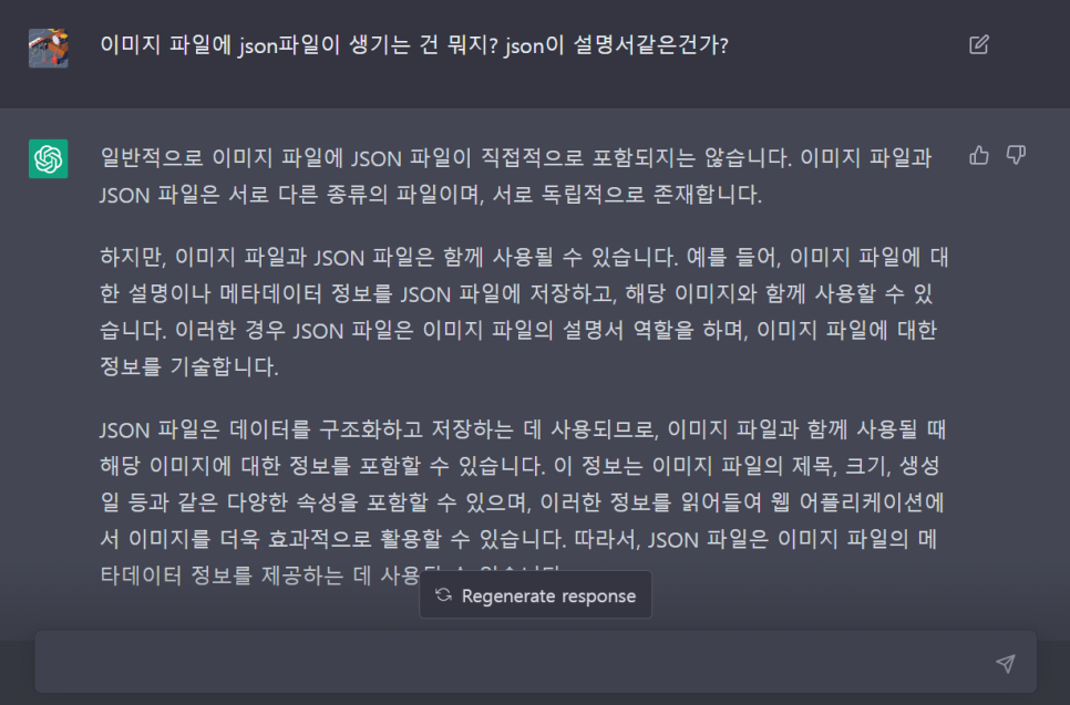 예를 들어, 이미지 파일에 대한 설명이나 메타데이터 정보를 JSON 파일에 저장하고, 해당 이미지와 함께 사용할 수 있습니다. 이러한 경우 JSON 파일은 이미지 파일의 설명서 역할을 하며, 이미지 파일에 대한 정보를 기술합니다.
