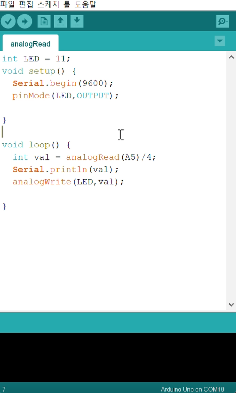 analogWrite(LED, val); //읽어온 analogRead(A5)/4 값을 LED(11번핀)으로 출력