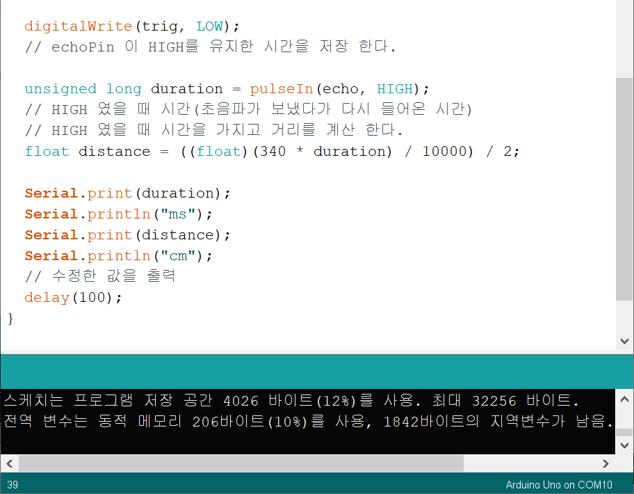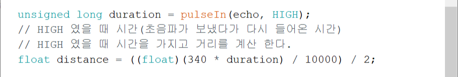 - 초음파가 앞에 물질에 부딪혀 다시 돌아오면 echo가 LOW 로 바뀌게 됩니다. HIGH 에서 LOW로 바뀔 동안의 시간을 측정하여 duration에 저장합니다.