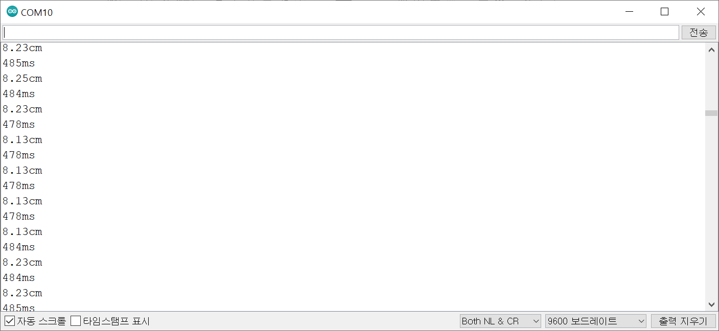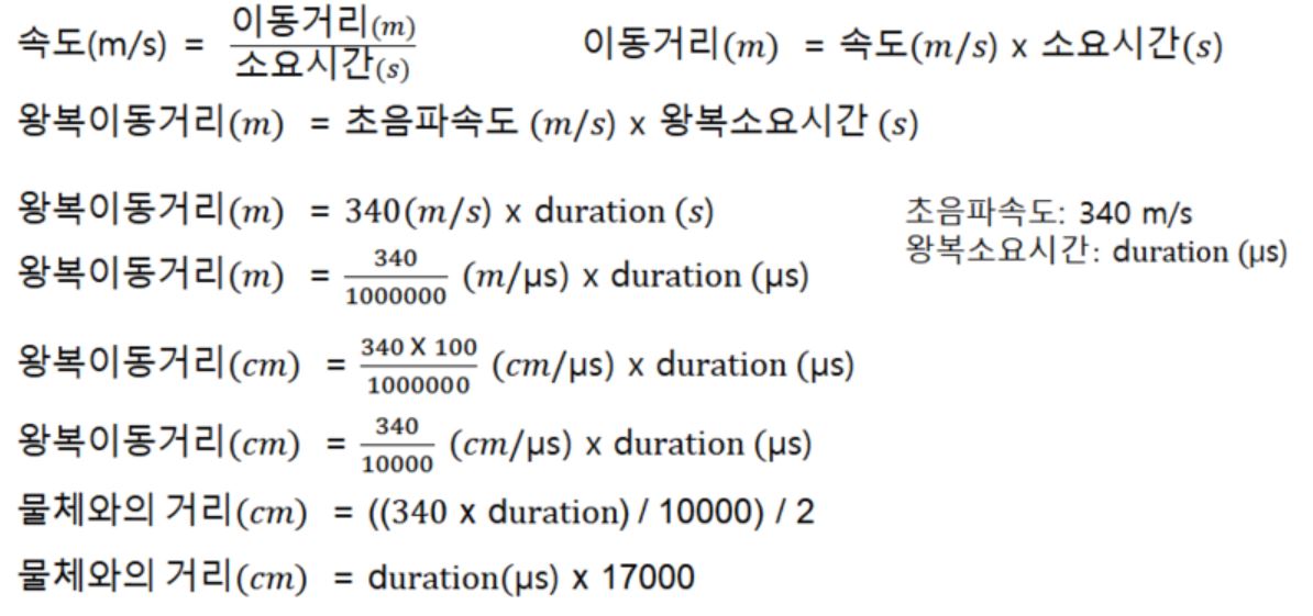 이 때 속도와 센서가 보낸 시간을 이용하여 거리를 구합니다.(왕복해서 오는 것이므로 결과를 2로 나눠줘야 합니다)