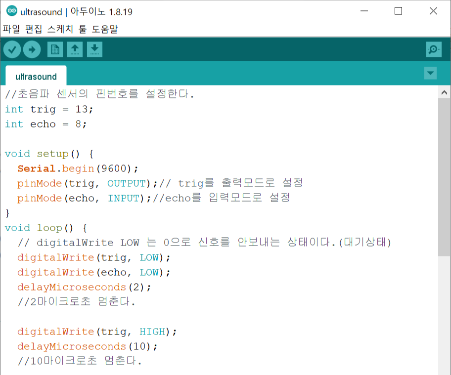 - trig이 HIGH 가 되면 초음파를 보내게 됩니다. 초음파를 다 보내면 echo가 HIGH상태를 유지하면서 되돌아오는 초음파를 받을 준비를 합니다.