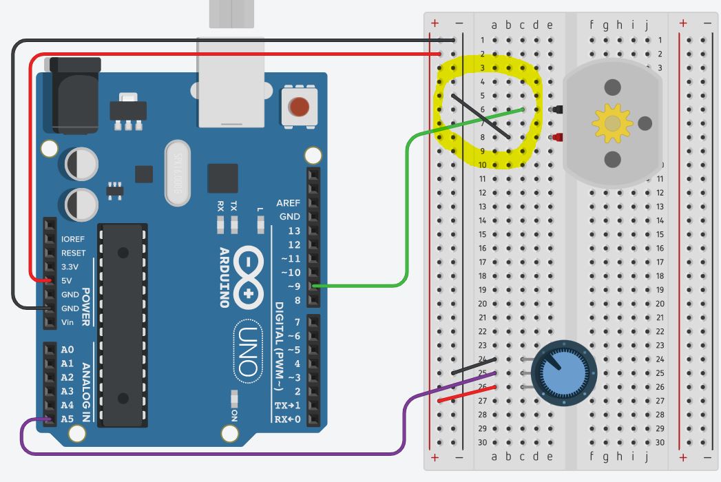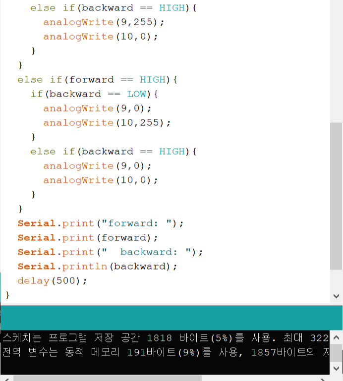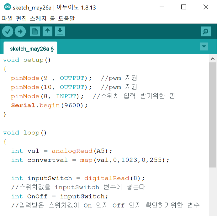 analogWrite(mpin,conval); //가변저항 값에 따라 모터의 속도를 조절한다.