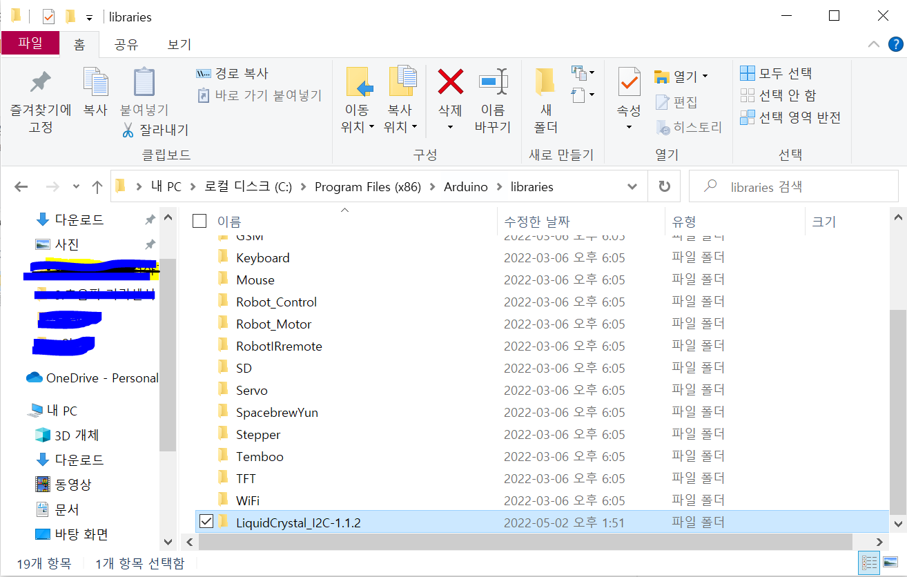 [C:\] -> [Program Files (x86)] -> [Arduino] -> [libraries]로 들어가서 저장합니다.