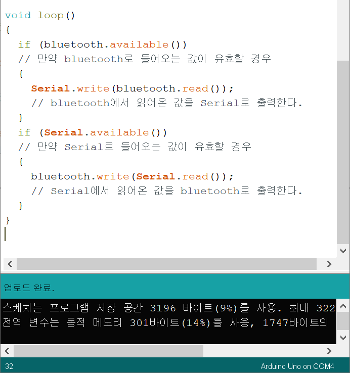 소스코드는 위에서 작성한 <2. 시리얼통신으로 블루투스 연결 > 과 같습니다.