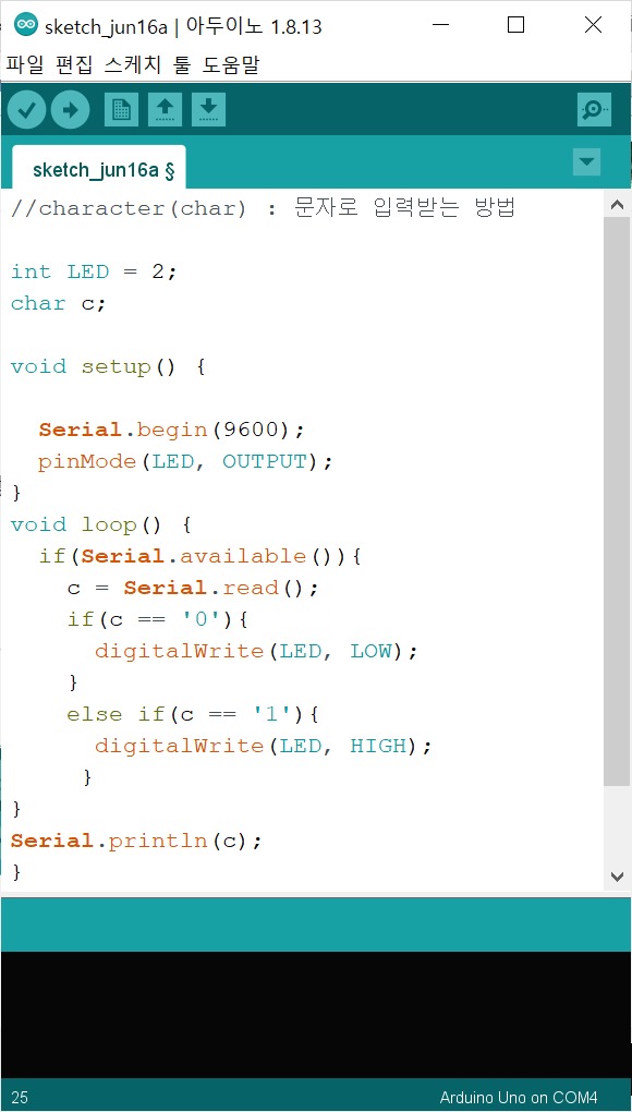 | // character(char) 문자로 입력받는 방법 int LED = 2; char c; void setup() { Serial.begin(9600); pinMode(LED, OUTPUT); } void loop() { if(Serial.available()){ c = Serial.read(); if(c == '0'){ digitalWrite(LED, LOW); } else if(c == '1'){ digitalWrite(LED, HIGH); } } Serial.println(c); } |