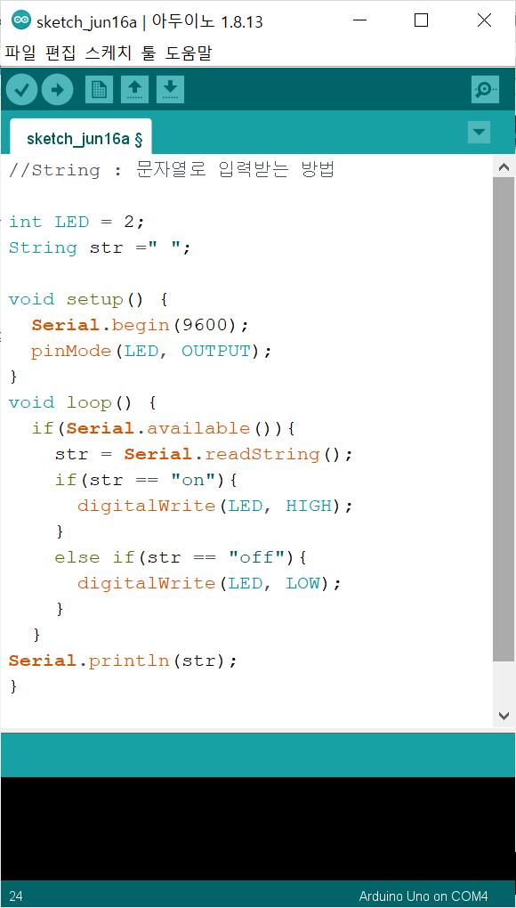 // String 문자로 입력받는 방법 int LED = 2; String str = " "; void setup() { Serial.begin(9600); pinMode(LED, OUTPUT); } void loop() { if(Serial.available()){ str = Serial.readString(); if(str == "on"){ digitalWrite(LED, LOW); } else if(str == "off"){ digitalWrite(LED, HIGH); } } Serial.println(c); } |