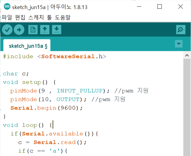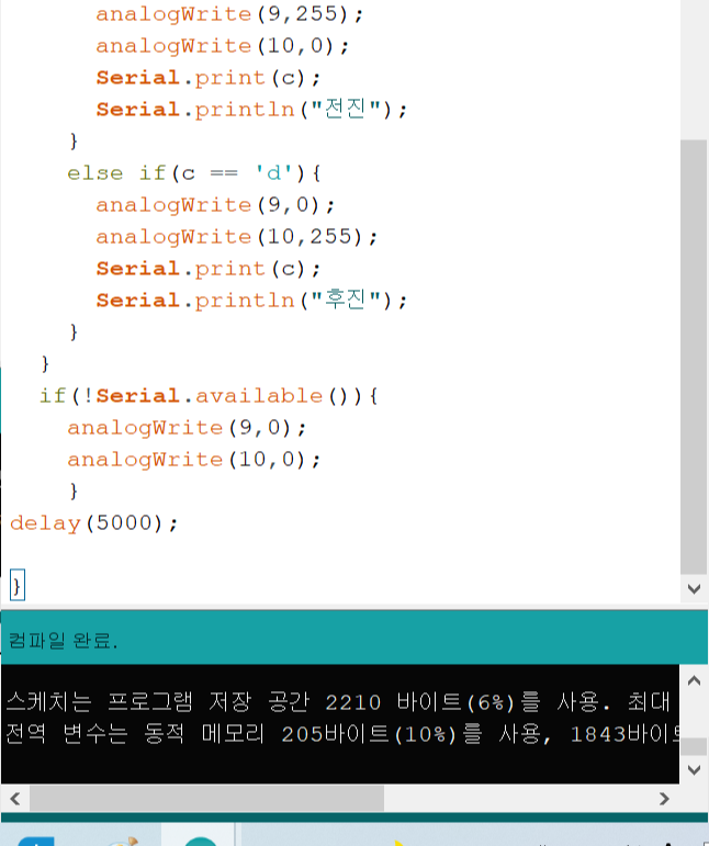| #include <SoftwareSerial.h> char c; void setup() { pinMode(9 , INPUT_PULLUP); //pwm 지원 pinMode(10, OUTPUT); //pwm 지원 Serial.begin(9600); } void loop() { if(Serial.available()){ c = Serial.read(); if(c == 'a'){ analogWrite(9,255); analogWrite(10,0); Serial.print(c); Serial.println("전진"); } else if(c == 'd'){ analogWrite(9,0); analogWrite(10,255); Serial.print(c); Serial.println("후진"); } } if(!Serial.available()){ analogWrite(9,0); analogWrite(10,0); } delay(5000); } |