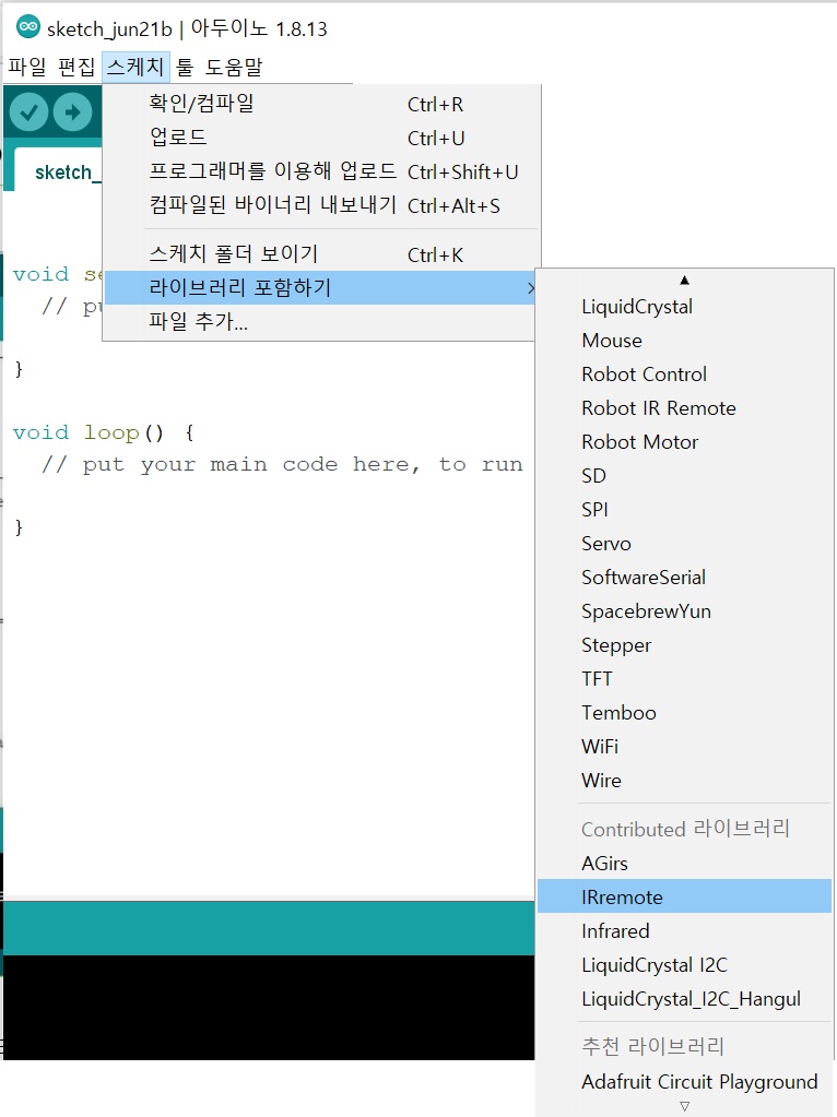 적외선 리모컨을 사용하기 위해선 IRemote 라이브러리를 설치해야 합니다.