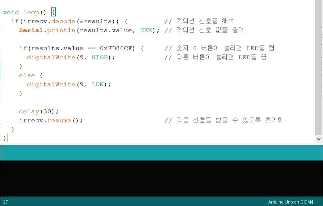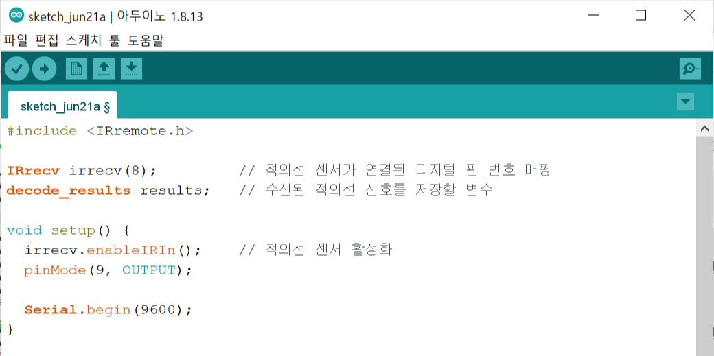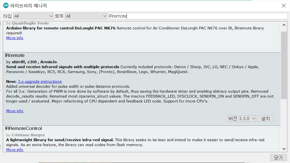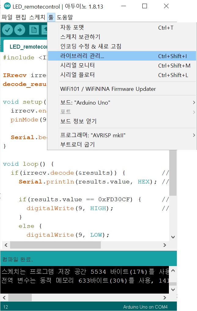 라이브러리 설치 방법: 툴 --> 라이브러리 관리 --> IRemote 설치