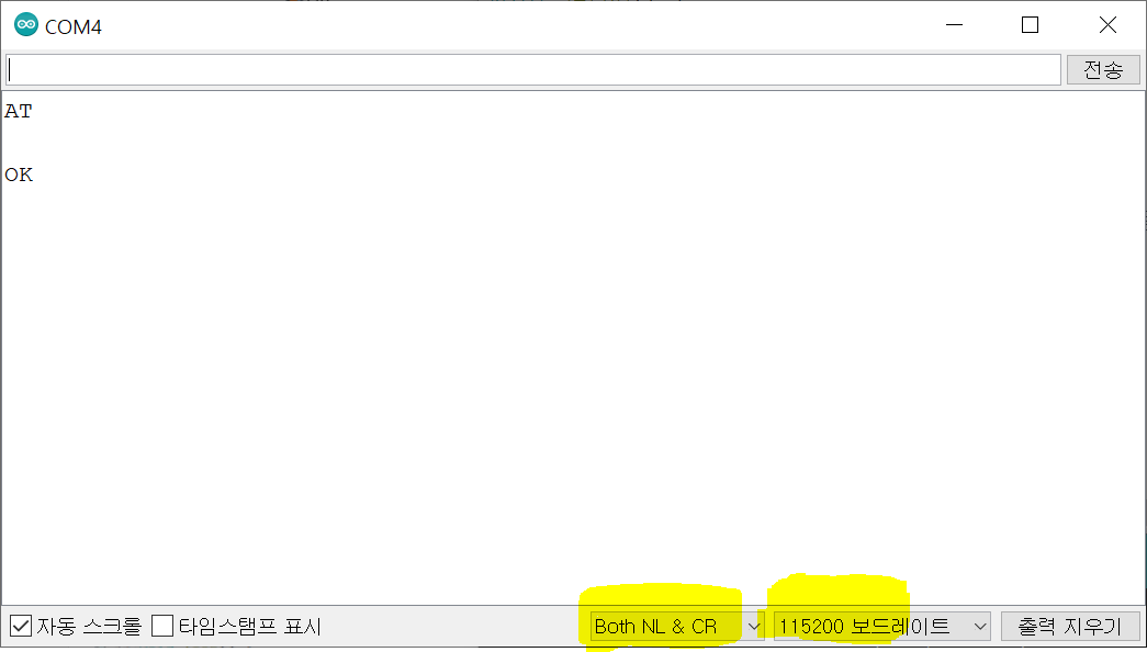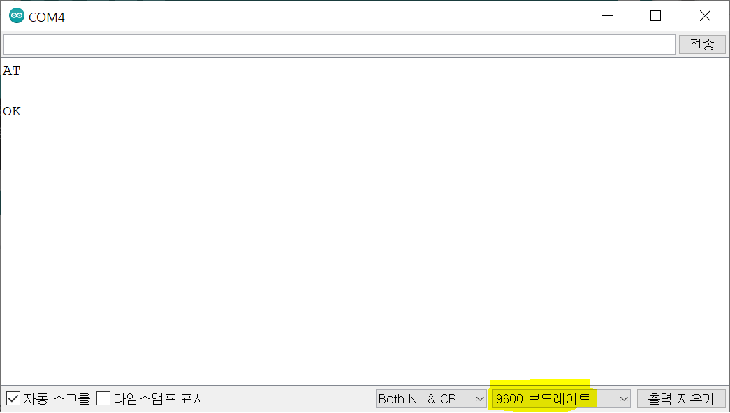 시리얼 모니터 화면 가장 아래의 보드레이트를 9600 으로 변경한 뒤 AT를 입력하여 연결을 확인하면 통신준비가 완료된 것 입니다.