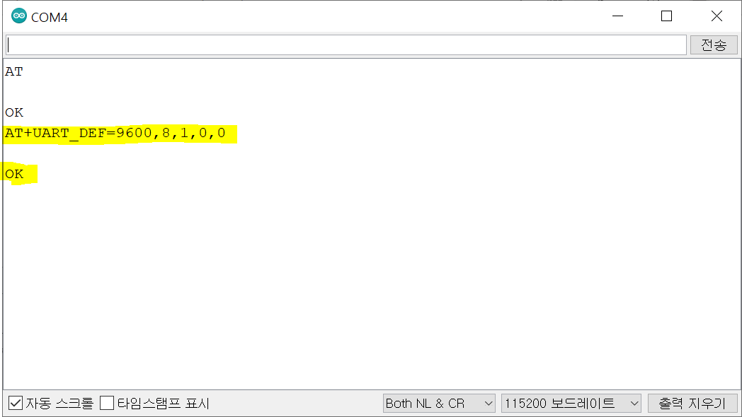 보드레이트를 변경하기 위해선 시리얼 모니터 입력창에 AT+UART_DEF=9600,8,1,0,0 을 입력해야 합니다.