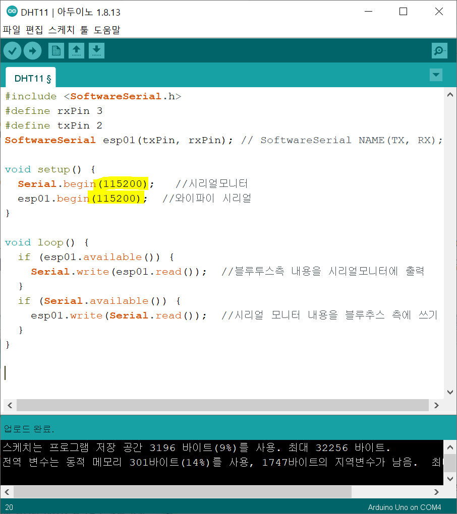 ESP-01의 보드레이트가 9600 으로 변경되었으니 소스코드의 Serial.begin(115200) 을 Serial.begin(9600) 으로 바꾸고
