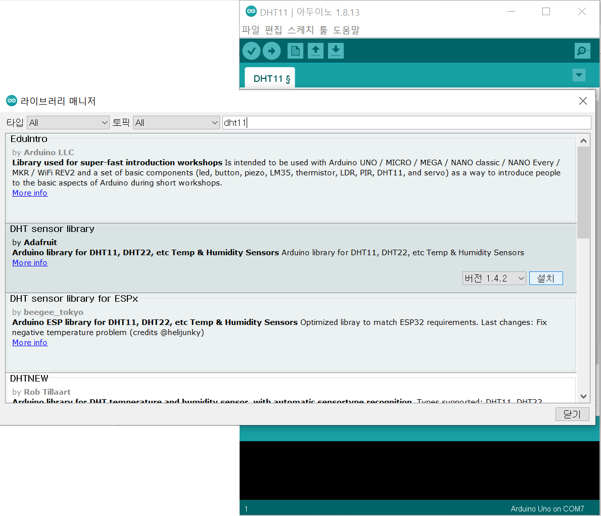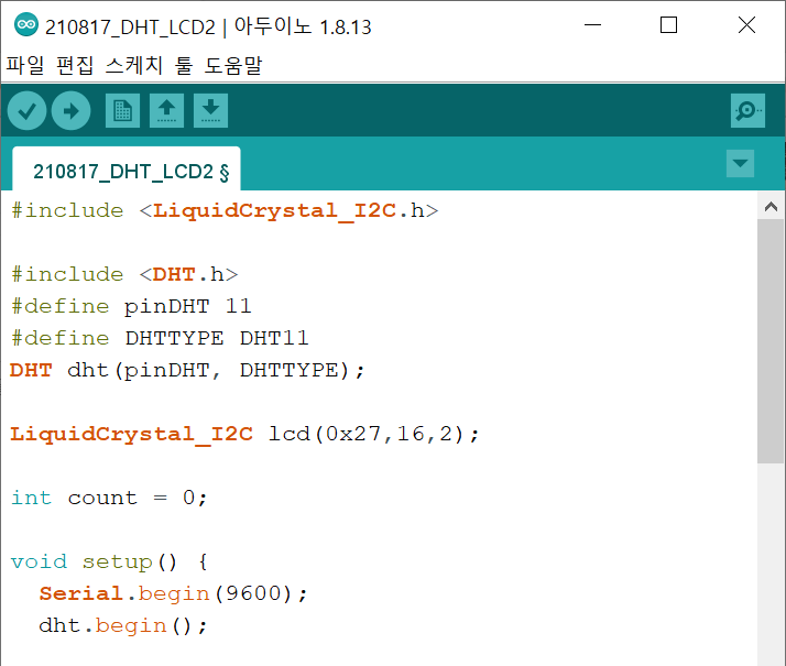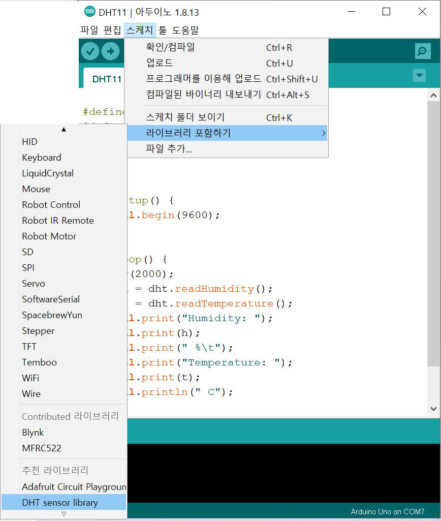 온습도 센서 사용을 위해 DHT sensor library 설치후 라이브러리 추가 합니다.