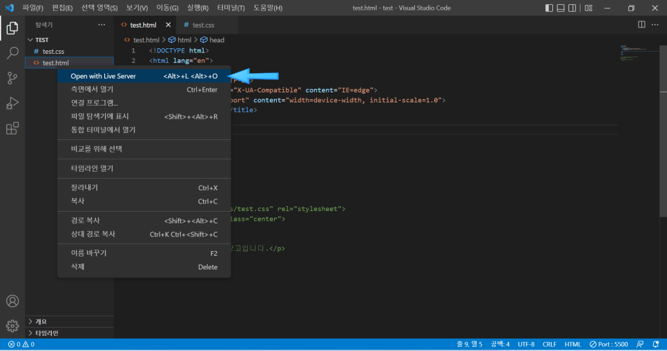 [아까 만든 파일위에서 우클릭 -> Open with Live Server 클릭 ]