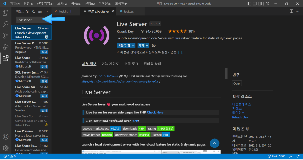 6) 바로 실행 화면이 나옵니다. Visual Studio Code 에서 실행한 파일의 코드를 변경한 후 저장하면 바로 변경화면으로 나옵니다.